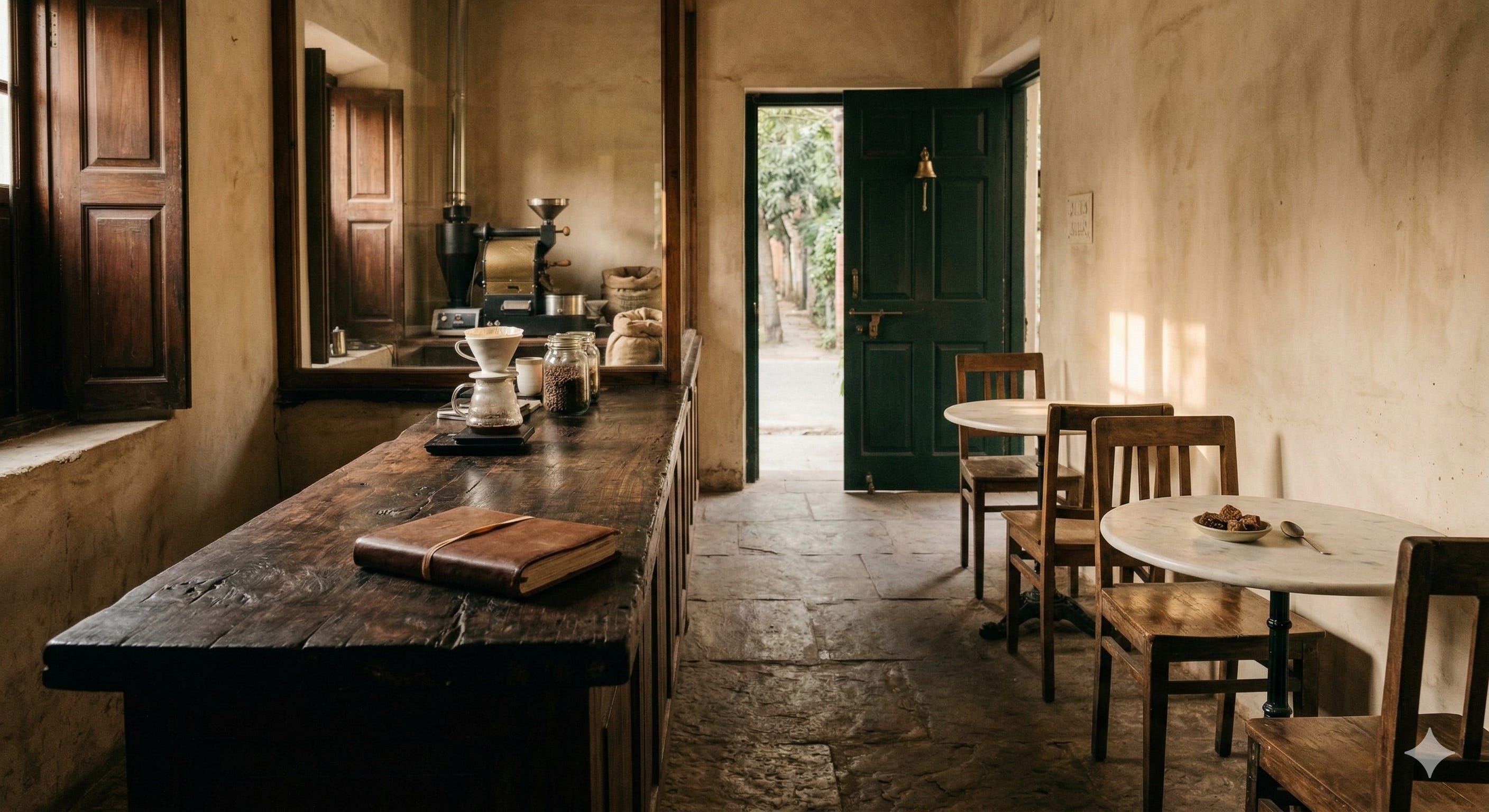 No signboard. Just a brass bell on a green wooden door. You ring it. Someone opens. The smell hits you before you’re inside: dark roast, cardamom, a trace of burnt sugar from the jaggery they use in their signature pour-over.